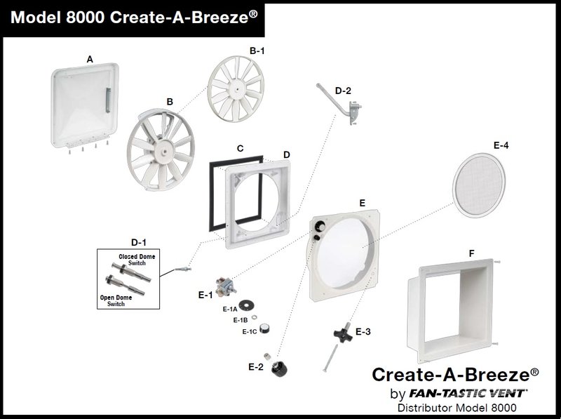 Fan tastic vent create a breeze model 8000. Fan tastic vent exploded parts views links in blue itema white dome kit k8020 81 itemb pancake style motor assembly k8017 00 new style itemb can style motor assembly k4017 09 itemb 1 white fan blade 8138 81 item c epdm rubber seal k1144 09. The fan tastic 801200 vent create a breeze powered roof vent is an entry level fan that is ideal for bathrooms or any vent opening measuring 14 x 14. Upgrade your tiny bathroom fan for superior ventilation.